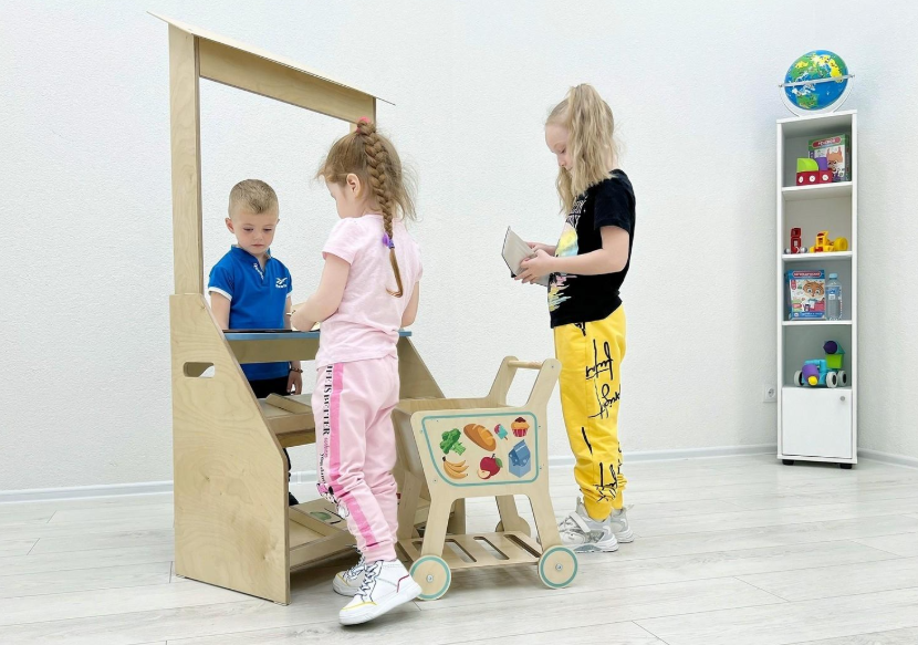 Дидактические игры: детский киоск «Магазин» с кассой, тележкой и продуктами. Макеты денег и пластиковые карты, копилки, кошельки, наборы для групповых игр по усвоению навыков финансовой грамотности на практике.