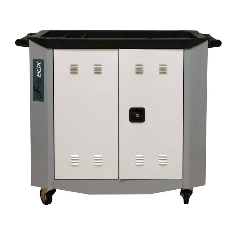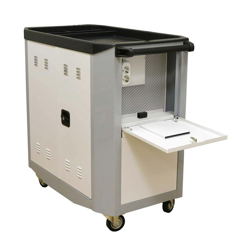 Тележка предназначена для зарядки и хранения ноутбуков и сформирована на базе металлического корпуса. Внутри корпуса размещены две полки которые разделены перфорированной перегородкой на четыре отделения. Два отделения снабжены сетчатыми перегородками и предназначены для хранения ноутбуков. Сетчатые перегородки съемные, позволяющие оптимально организовать внутреннее пространство, при количестве ноутбуков менее 16 штук. Максимальное количество ноутбуков по 8 штук на каждой полке.