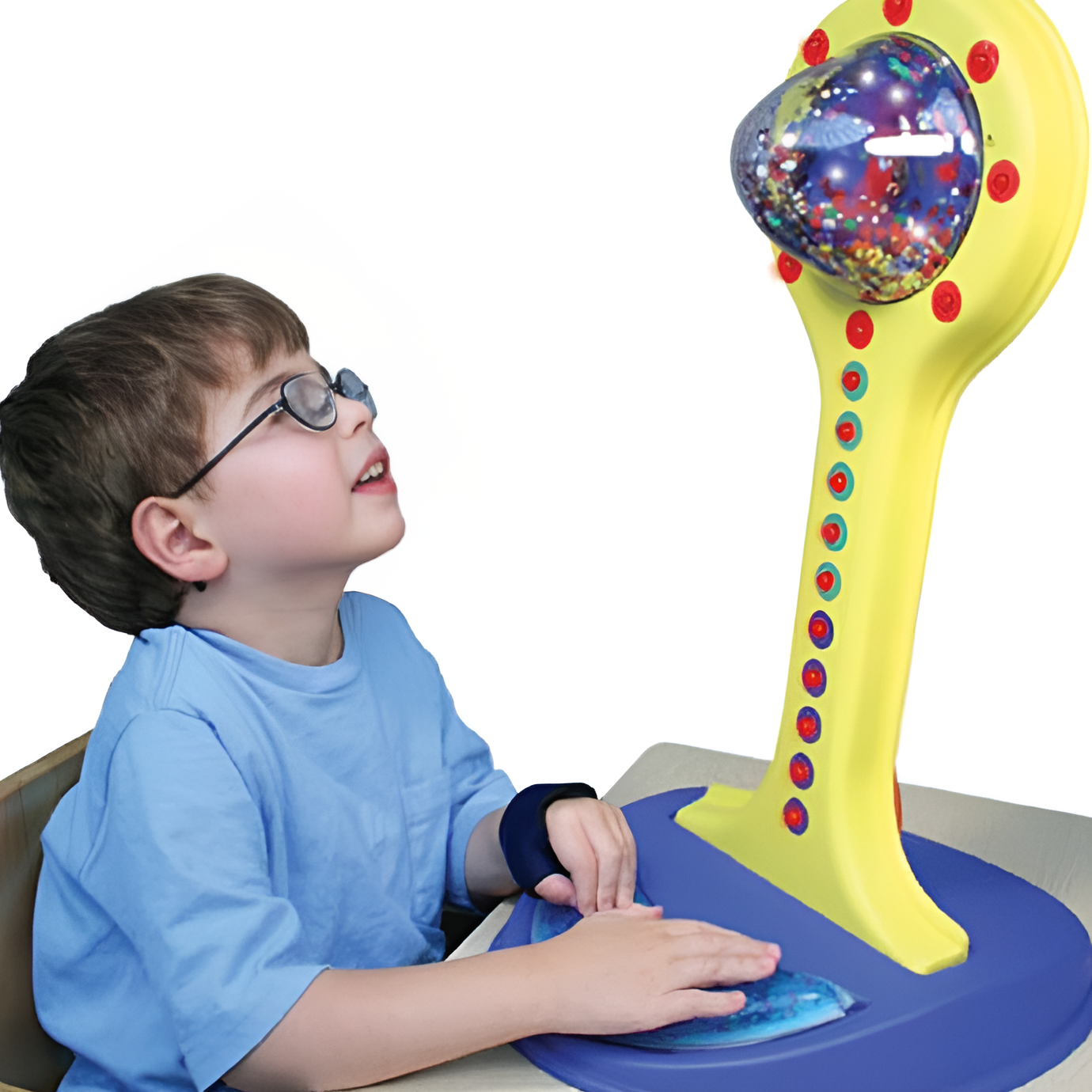 В зависимости от силы нажатия на гелевую подушечку появляются различные звуковые и визуальные эффекты: звучит музыка, загораются огоньки, начинают кружится разноцветные блестки под куполом.