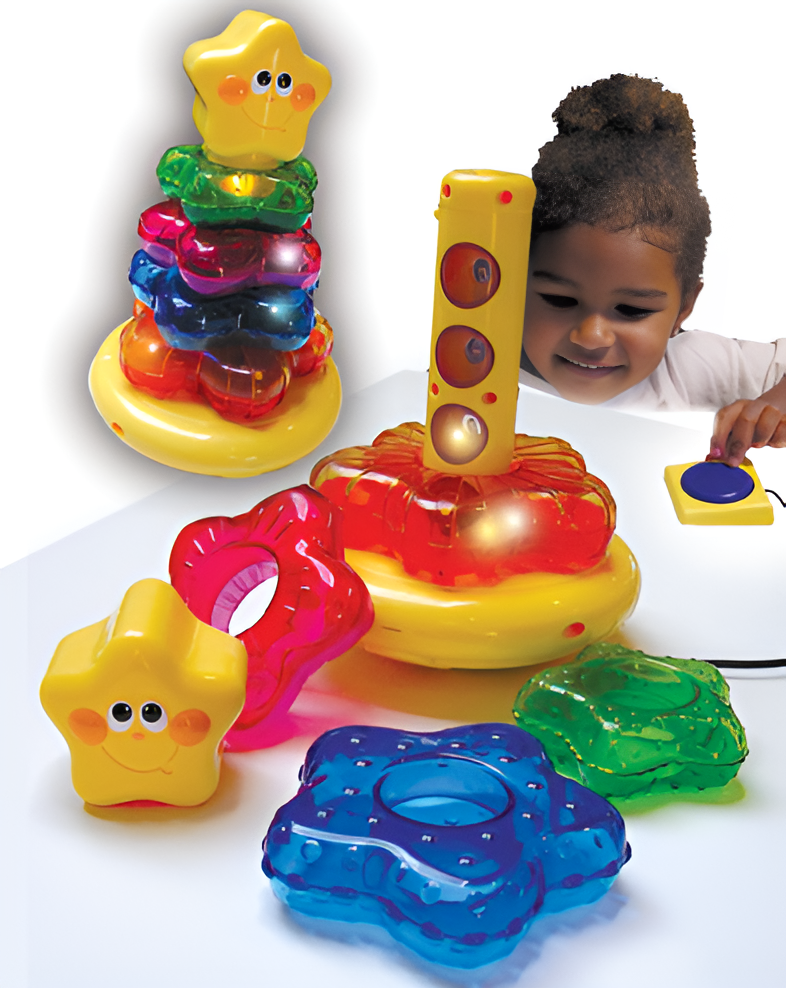 Кольца пирамидки выполнены в виде звезд. Когда пирамидка составлена – звучит музыка, сверкают огни – что доставляет особую радость малышу.
