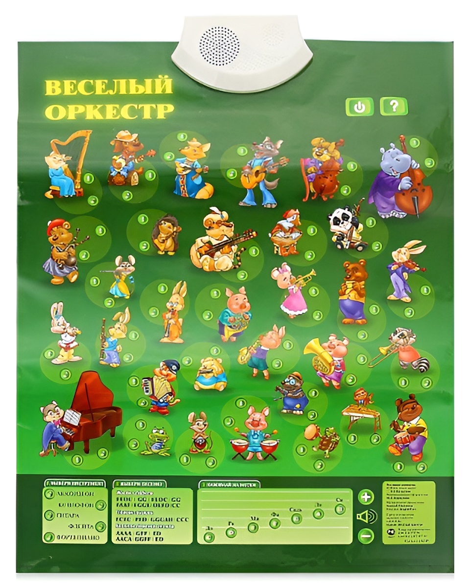 Звуковой плакат "Веселый оркестр" содержит информацию, звуки и изображения самых разнообразных музыкальных инструментов.