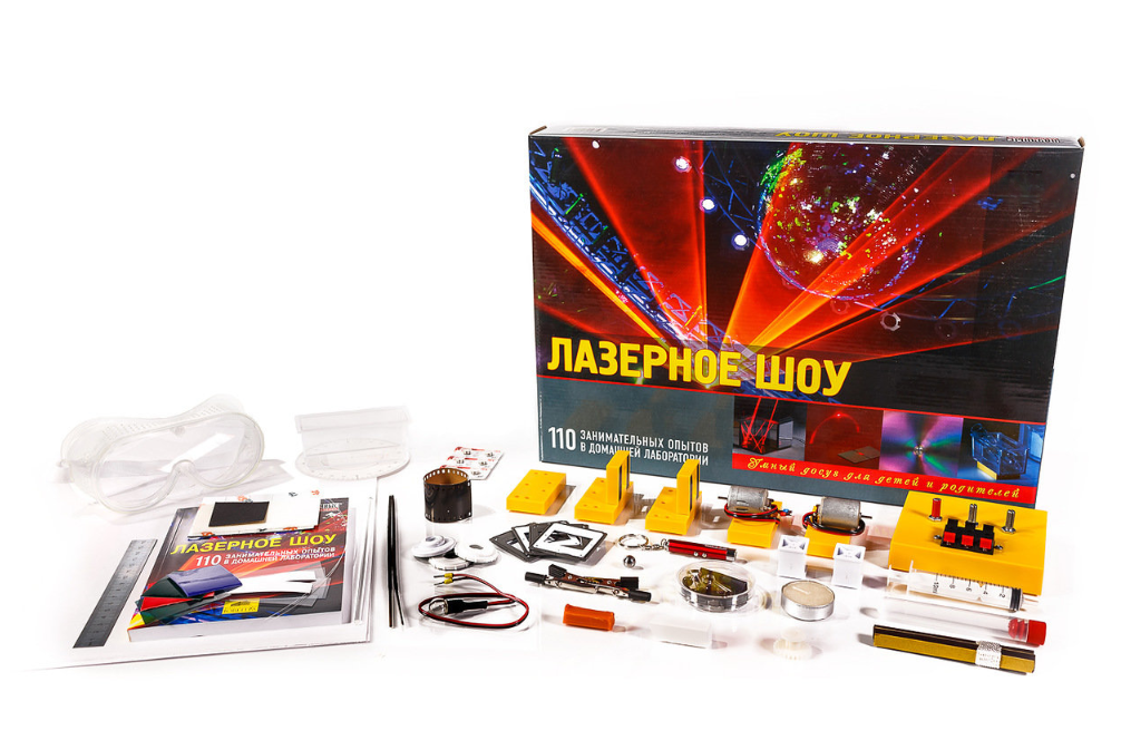 Набор «Лазерное шоу» позволяет проследить тысячелетнюю историю эволюции представлений человека о природе света. Все, кто интересуется исследованиями световых эффектов, смогут провести более 100 различных экспериментов.