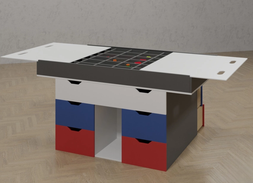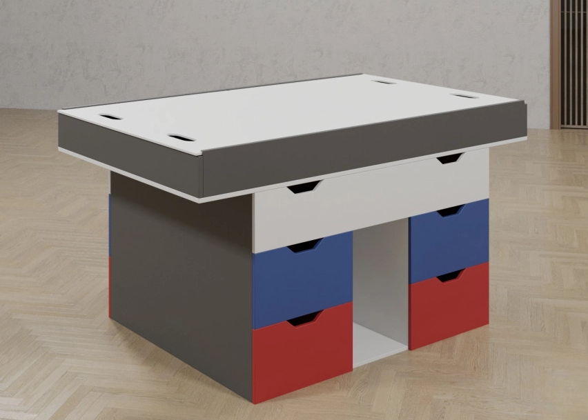 Занятия по робототехнике и конструированию роботов - интересный и сложный процесс. Такие уроки помогут развивать много важных и полезных качеств, которые обязательно пригодятся малышам в дальнейшей жизни. Для того, чтобы процесс конструирования и роботостроение приносил максимальное удовольствие необходимы не только детали для сборки, но и качественная мебель. Такой стол для робототехники - отличный вариант для тех, кто ценит удобство и комфорт. Данный стол содержит столешницу с большой площадью, что позволит ребятам конструировать с максимальным комфортом. Также столешница может раздвигаться с обе стороны, открывая дополнительное пространство со специальными ячейками, в которых дети смогут хранить проекты, находящиеся в процессе сборки. Целых десять вместительных выдвижных ящика могут вместить как личные вещи детей, так и материалы, которые нужно всегда иметь под рукой. Этот стол изготовлен из качественных и крепких материалов, и прослужит детям во время занятий по конструированию роботов в течении долгого времени.