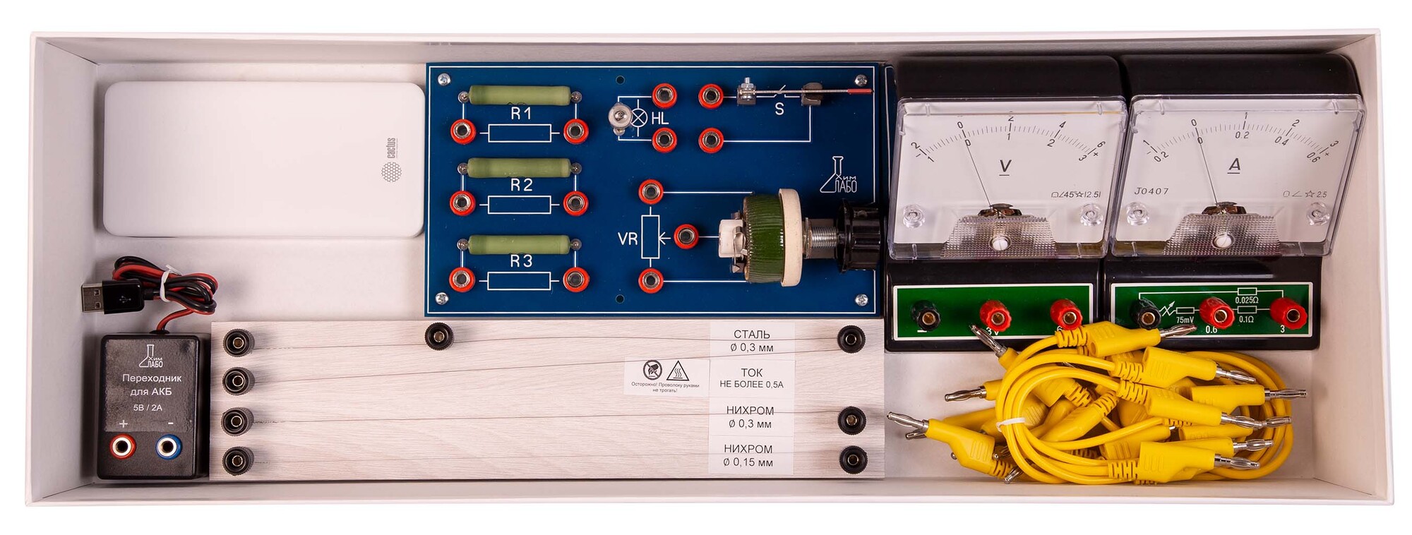 Комплект позволяет измерять сопротивление резистора, мощность и работу электрического тока, исследовать зависимость силы тока от напряжения, зависимость сопротивления от длины проводника, площади поперечного сечения и удельного сопротивления, а также проверять зависимость напряжения при последовательном соединении проводников и зависимость тока при параллельном соединении проводников.