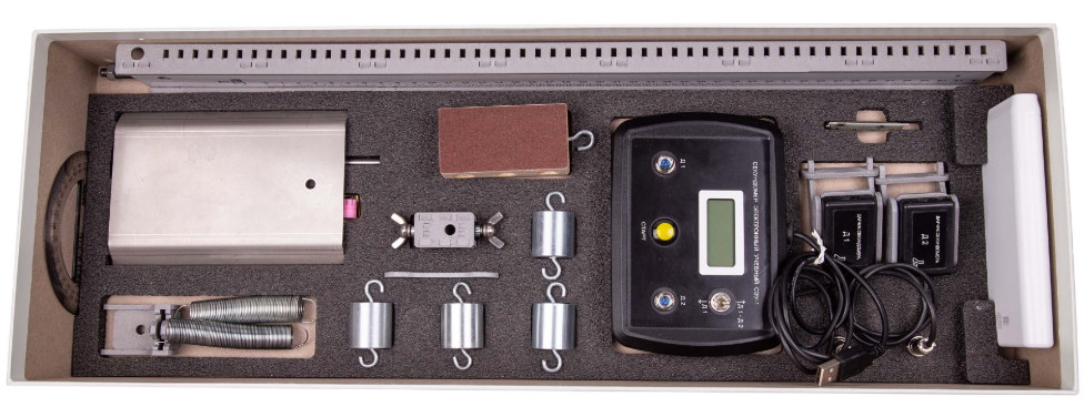Комплект позволяет измерять ускорение и среднюю скорость движения бруска по наклонной плоскости; частоту и период колебаний математического и пружинного маятников, а также исследовать зависимости ускорения бруска от угла наклона направляющей; периода (частоты) колебаний нитяного маятника от длины нити, периода колебаний пружинного маятника от массы груза и жесткости пружины, и независимости периода колебаний нитяного маятника от массы груза.