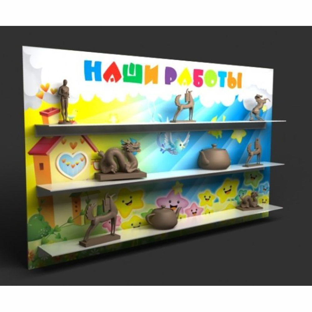 Необычный объемный стенд принесет радость детям и взрослым. Малыши смогут отнести свои работы, выполненные на занятии лепки, на выставку. Это поможет избежать путаницы в работах, сохранит их в первоначальном виде. Стенд будет гарантировать, что работы детей не потеряются. Название стенда оформлено буквами разного цвета. Это позволит привлечь внимание к стенду. На фоне изображена интересная картинка: необычный домик, желтые звездочки, облака и солнце лучистое. Стенд выполнен из высококачественного материала. Стенд можно поместить в раздевалке сверху на шкафчиках. Он будет вдохновлять детей на новые поделки.