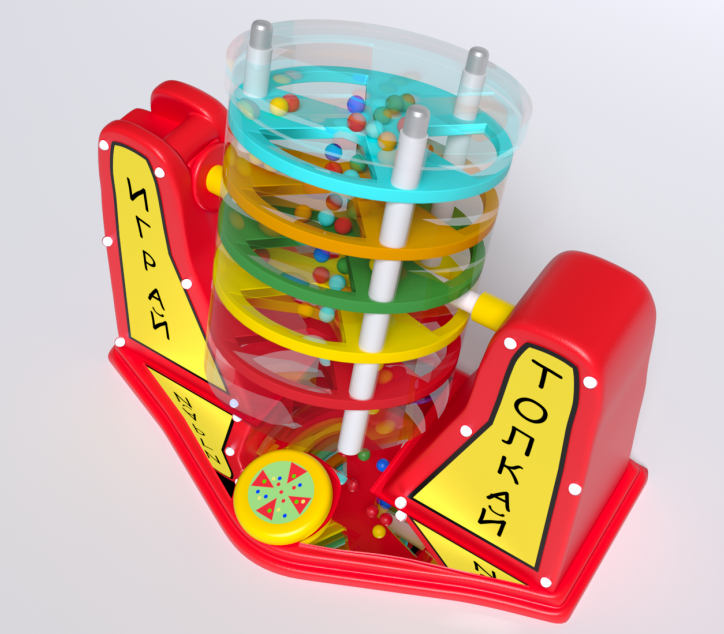 Когда ребенок нажимает на кнопку, прозрачная труба начинает вращаться и шарики внутри неё сыплются вниз, завораживающе перекатываясь по разноцветным круглым «уровням» с отверстиями внутри и воспроизводя лёгкий звук, похожий на шум дождя.