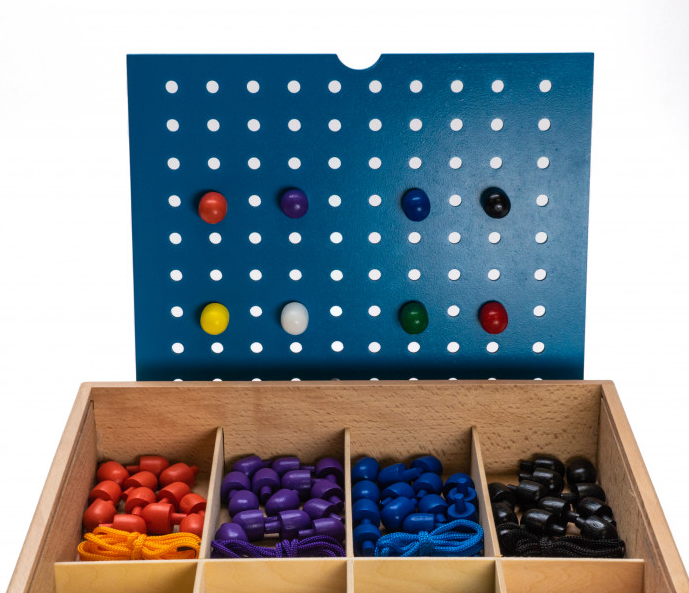 Модуль № 12 (J2) включает отсортированные по цвету фигурки на ножках и комплект шнурков (мозаика, шнуровка). Развивает зрительно-моторную координацию.