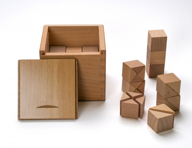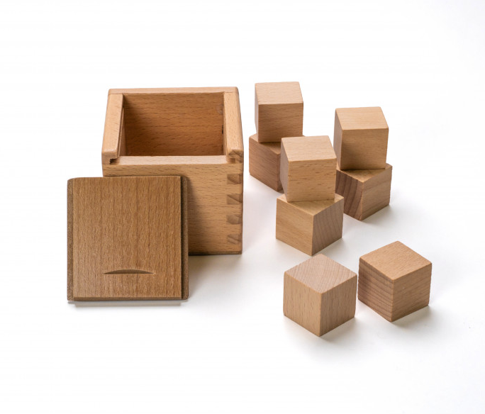 Третий: восемь маленьких кубиков, объединенных в один большой «куб из кубиков». Отличное подспорье в усвоении таких понятий, как «часть», «половина», «целый предмет», «одна четверть» и др.