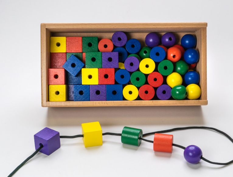 Модуль № 11 (J1) состоит из цветных бусин, имеющих кубическую, цилиндрическую и шарообразную формы (цветные тела) и ниточки для их нанизывания. Прекрасно развивает мелкую моторику, дает первые навыки классификации предметов по форме и расцветке.