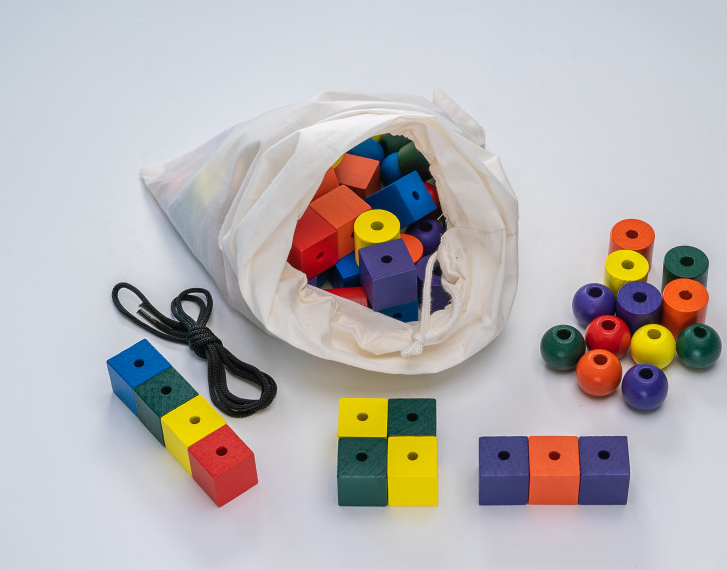 Модуль № 11 (J1) состоит из цветных бусин, имеющих кубическую, цилиндрическую и шарообразную формы (цветные тела) и ниточки для их нанизывания. Прекрасно развивает мелкую моторику, дает первые навыки классификации предметов по форме и расцветке.