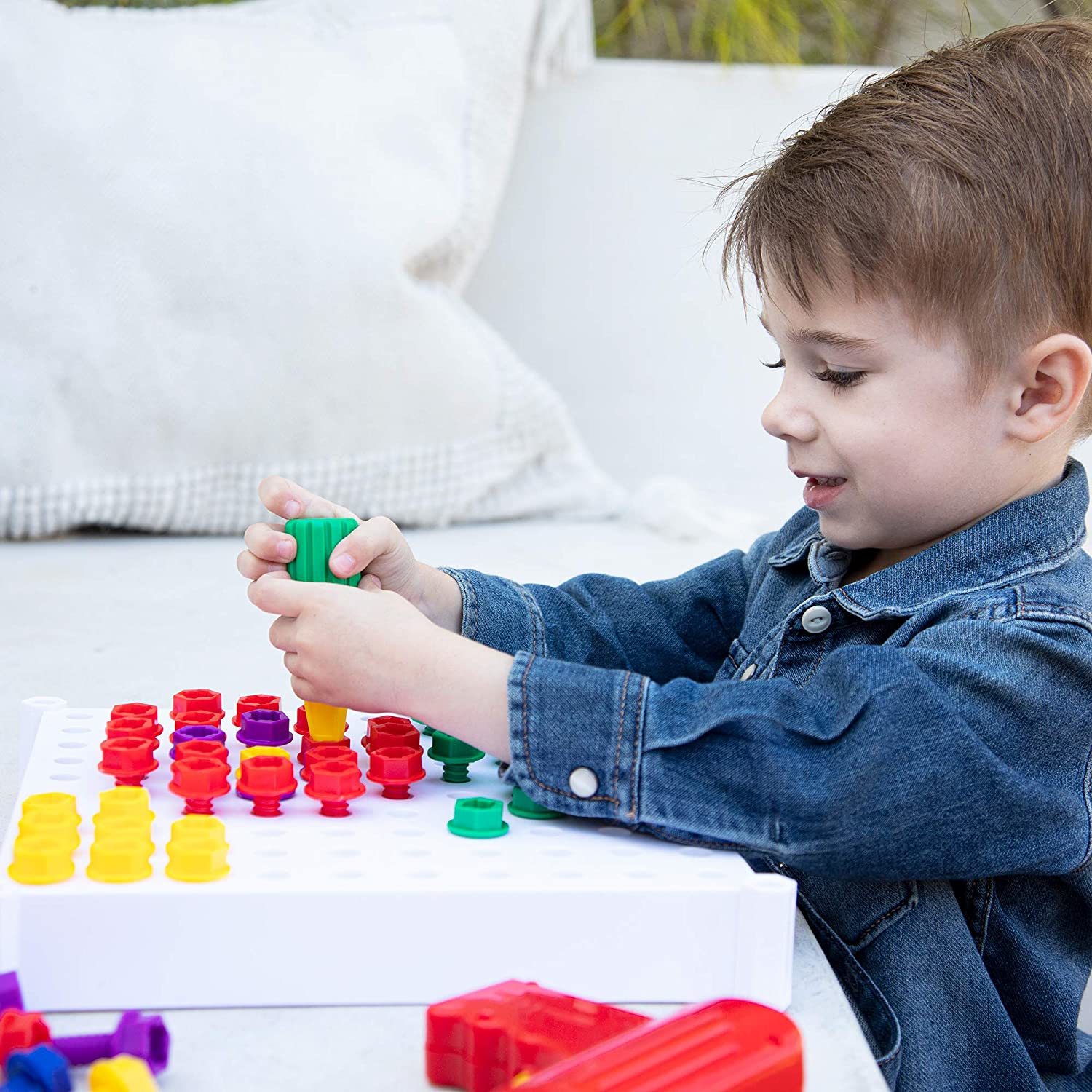 Базовые насыщенные цвета болтиков прекрасно контрастируют с белым фоном рабочей панели, позволяя ребенку сосредоточиться на процессе создания осознанного узора.