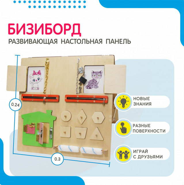 Бизиборд изготовлен из натуральной древесины - это насыщенный развивающий игровой опыт для малышей от 3-х лет. Он оснащен дверцами с защелками, меховыми валиками, сортером с фигурками на штырьках и одежными застежками на молнии. Бизиборд №2 развивает моторику и помогает детям развить фингермоторику и координацию движений. С ним игра становится не только увлекательной, но и познавательной.