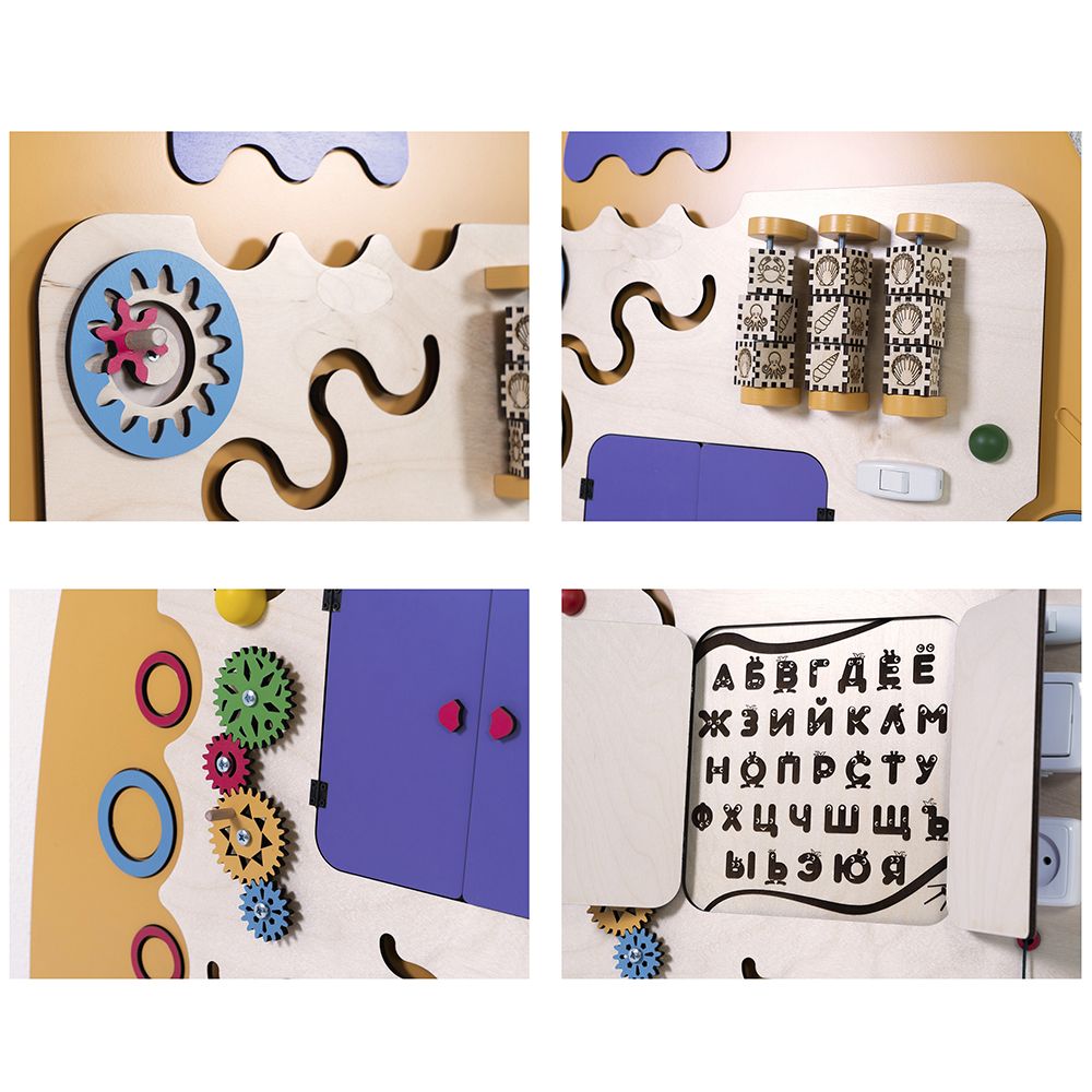 Развивающий сенсорный Бизиборд «Гвазго» украсит стену любого образовательного учреждения. Необычный внешний вид непременно привлечет внимание детей, а встроенные развивающие элементы займут надолго их внимание.