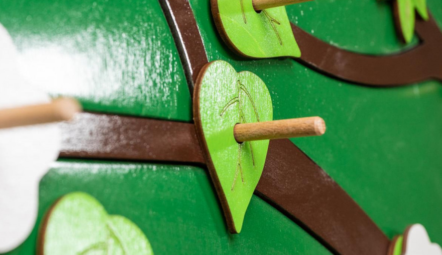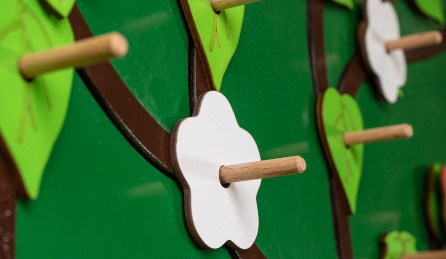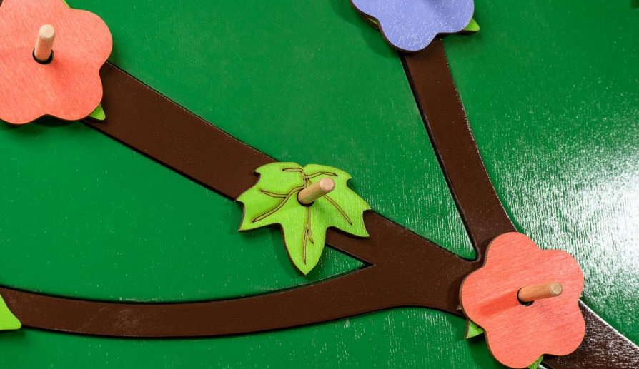 Декоративно-развивающая панель в виде дерева представляет собой форму дерева с пышной и однородной кроной. На веточках панели расположены штырьки, на которые можно надевать листики и цветочки разного цвета и формы. Все детали изготовлены из натурального дерева, тщательно отполированы и отшлифованы, чтобы гарантировать безопасность и долговечность. Эта игровая панель подходит для детей от 3-х лет и особенно полезна для детей с ограниченными возможностями.