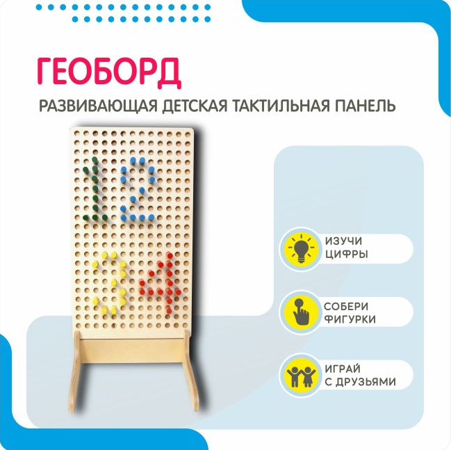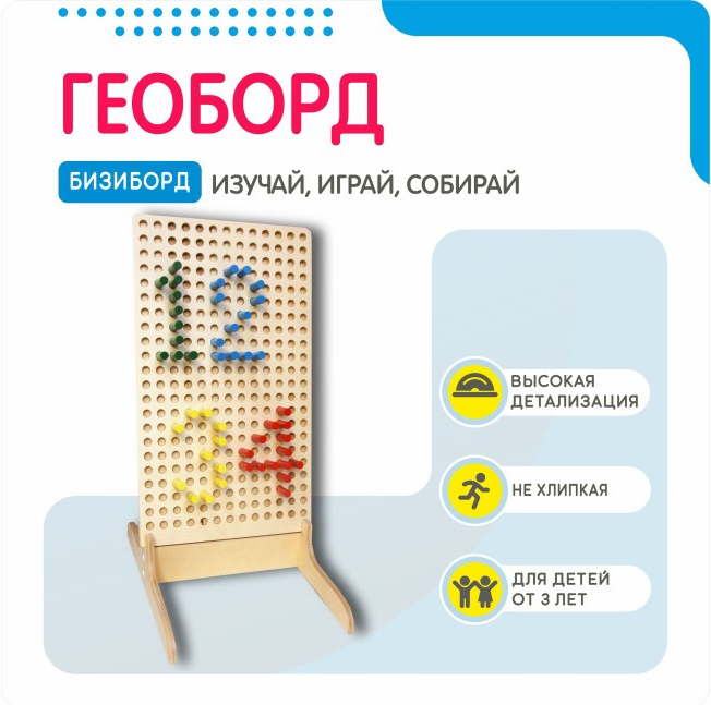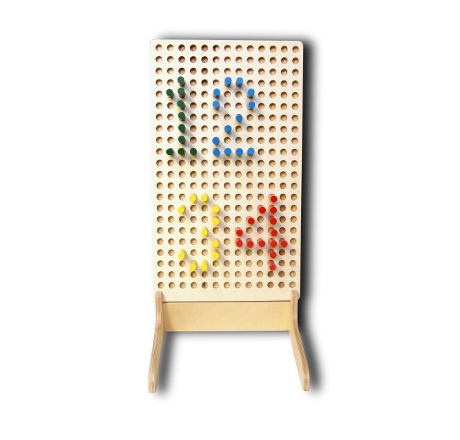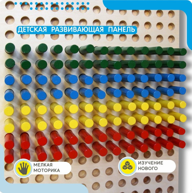 Это многофункциональный детский игровой модуль. Основа – деревянная доска прямоугольной формы с отверстиями для разноцветных штырьков, которые можно переставлять в произвольной последовательности, создавая схематические объёмные изображения. Производитель позаботился и о качестве игрушки - все элементы отшлифованы и покрыты экологически чистыми и безопасными даже для детей грунтом, лаком и краской.