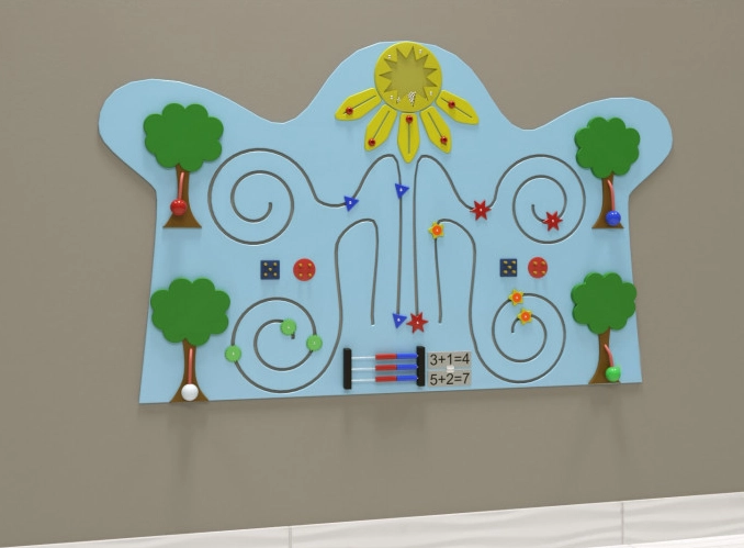 Настенная панель на тему счета, фигур и цветов предназначена для обучения детей от 1 года. Основа панели выполнена в спокойном голубом цвете, детали не отличаются броскостью и яркостью – всё это благотворно влияет на восприятие информации детьми.