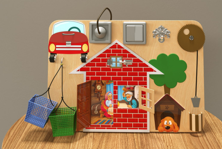 На деревянной панели изображен кирпичный домик, внутри которого можно увидеть сказочных персонажей Деда и Бабку – стоит лишь открыть дверцу и окошко. Рядом расположен яркий объёмный автомобиль (вид спереди), собака в будке, дерево и колодец, а ещё имеются различные тактильные приспособления для игры. Поверхность отшлифована и покрыта безопасными лаком и краской.