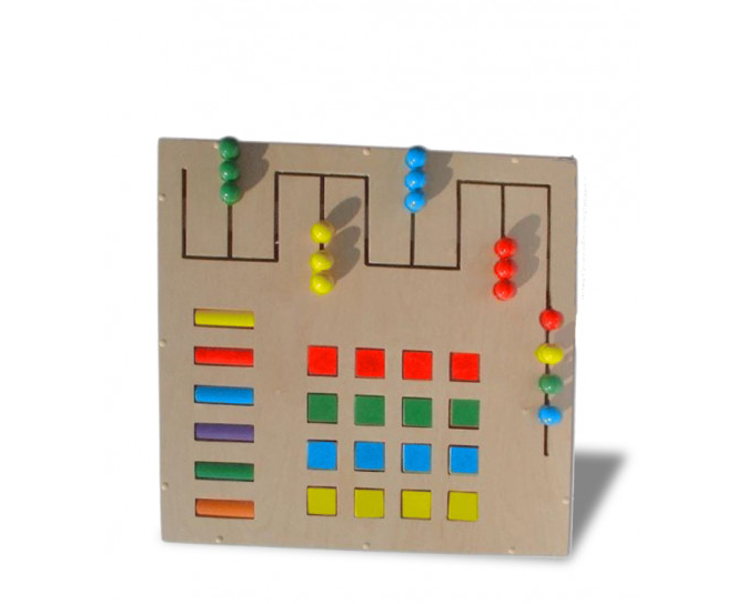 • Получится замечательная игра, если малыш сам будет стараться перемещать кружки. На панели представлены разные геометрические формы: квадраты, круги и прямоугольные палочки. Показывайте на каждую и вслух произносите цвет и форму фигуры.