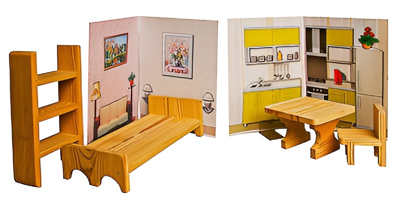 Декорации представляют собой полноцветные карточки формата А4, изготовленные из картона и ламинированные пленкой. Служат для конструирования интерьера спальни, гостиной и кухни. Держатели пластиковые, прозрачные, не закрывают изображений и надежно удерживают декорации в вертикальном положении. Мебель изготовлена из дерева, не окрашена.