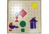 Панель с отверстиями и 84 геометрическими фигурами 6 форм, 3 размеров и 6 цветов. Фигуры имеют штыри для фиксации на панели, которая может располагаться как в горизонтальном положении, так и крепиться к стене вертикально.