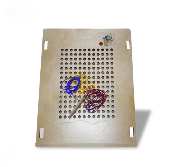 Малышу дается в руки палочка с разноцветными нитями, для вышивания. Эта игра рассчитана на развитие и на координацию движении. Мелкая моторика способствует общему развитию у детей. Мелкая моторика имеет взаимосвязь с нервной системой, зрением, вниманием, памятью и восприятием ребенка. Эта игра поможет малышу расслабиться и сосредоточиться на процессе.