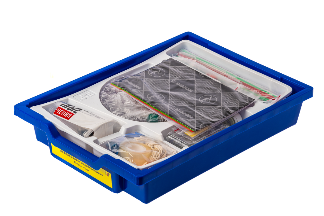 Каждый набор укомплектован в индивидуальную пластиковую систему хранения, которая закрывается прозрачной пластиковой крышкой на защелках для обеспечения наблюдения за содержимым. Оборудование внутри систем хранения расположено в ложементах для надежной фиксации при транспортировке.