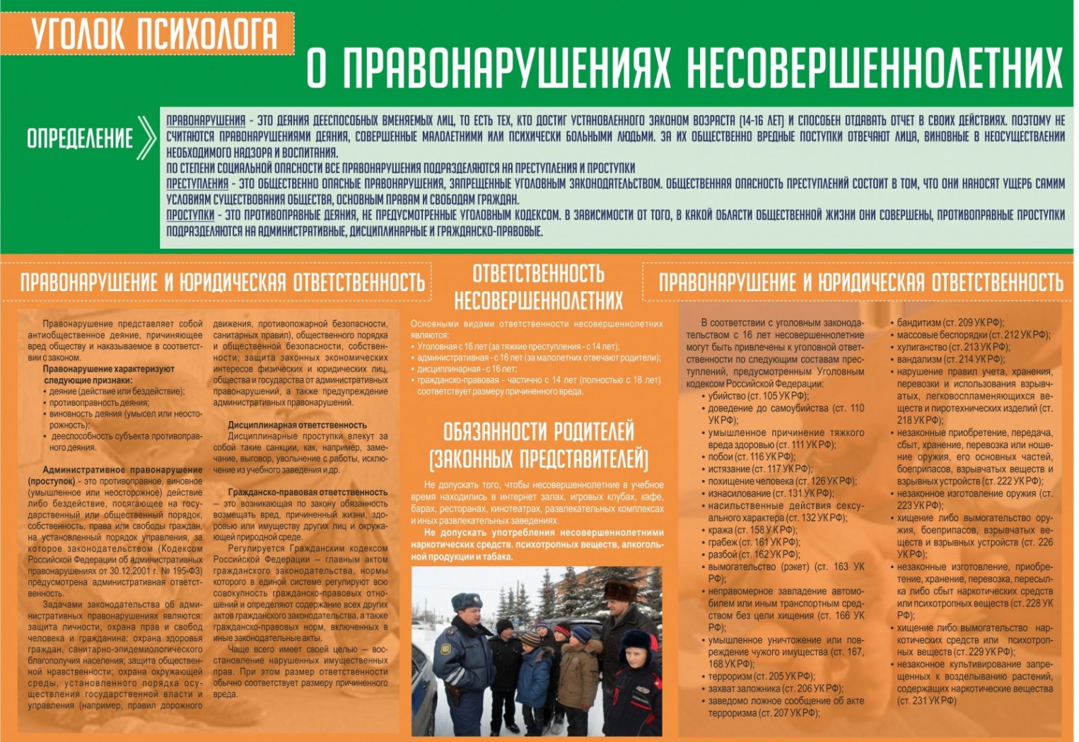 Один из нескольких стендов из моделей «уголок психолога» уведомляет школьников о правонарушениях несовершеннолетних. Такая модель стенда не имеет ярких красок и рисунков, вся цветовая гамма спокойная, но в то же время привлекает внимание. На стенде «о правонарушениях» имеется полное описание о юридической ответственности и о других последствиях правонарушений. Текст качественно нанесен на стенд и покрыт пленкой, поэтому надолго сохраняет качество текста и фоновый цвет. Данная модель стенда не имеет дополнительных карманов, так как полностью покрыта текстом и одной иллюстрацией.