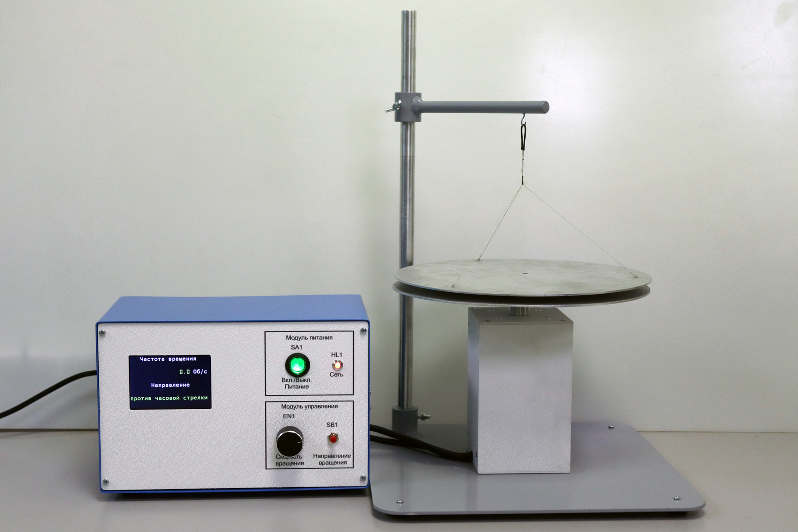 - наличие подвешенного на нитях вращающегося диска и диска, закрепленного на валу электродвигателя и установленного соосно на некотором расстоянии от первого, который приводится в движение с помощью встроенной измерительной системы;